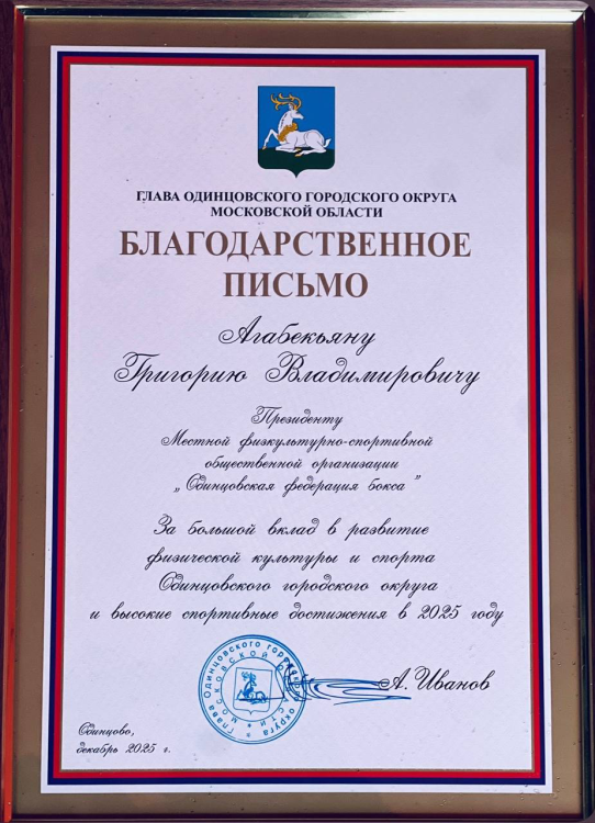Глава Одинцовского городского округа Андрей Иванов торжественно наградил Григория Агабекьяна, президента Федерации бокса Одинцовского городского округа, и его команду. Награда была вручена за выдающиеся спортивные достижения, продемонстрированные на международных и всероссийских соревнованиях, а также за значительный вклад в развитие бокса в округе. Под руководством Григория Агабекяна спортсмены Одинцовской федерации бокса добились высоких результатов, что стало возможным благодаря его преданности делу и самоотверженной работе команды.