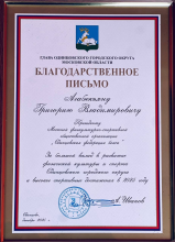 Глава Одинцовского городского округа Андрей Иванов торжественно наградил Григория Агабекьяна, президента Федерации бокса Одинцовского городского округа, и его команду